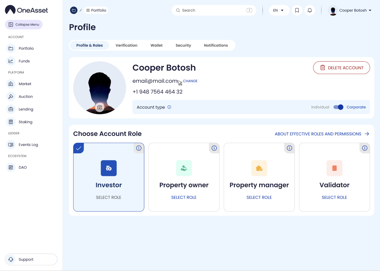 Account settings: Profile, Verification, Linked Wallets, Security, Notifications (preferences), Delete account.
