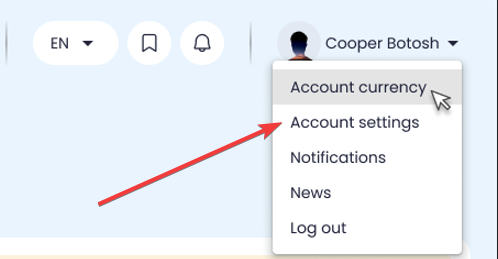 Header → Profile avatar menu: Account settings, Notifications, News, Log out.