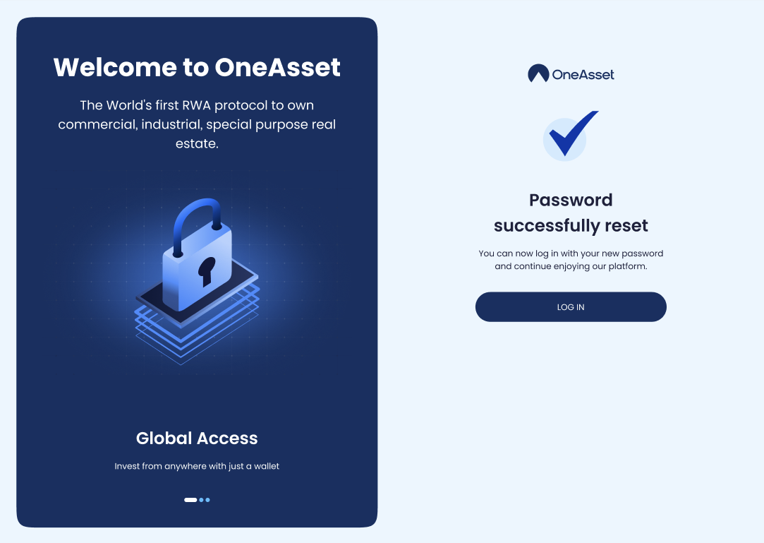 Upon successful completion of your password update, you will see a Success Message and a Login button.