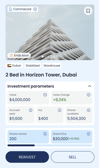 Owned lists the assets for which you currently hold shares. Each row represents one asset position and summarizes your share count, value, yield accrual, and PnL.