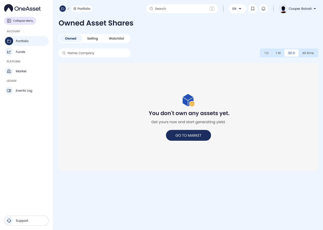 If you have no assets, the page shows: “You don’t own any assets yet. Get yours now and start generating yield” with Go to Market.