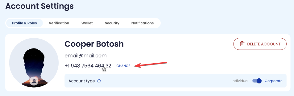 If no phone number is set, enter the number and click Save; if already set, click Change to start the update flow.