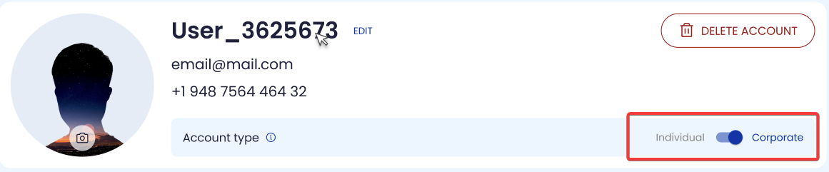 Use the Individual / Corporate toggle to set the account type.