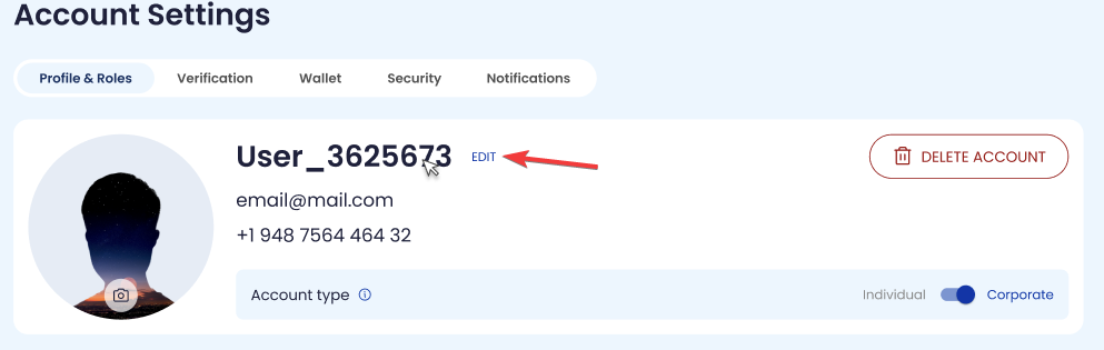 Settings centralizes account configuration and access controls. It is the entry point for managing profile identity, verification status, linked wallets, security protections, and notification preferences.