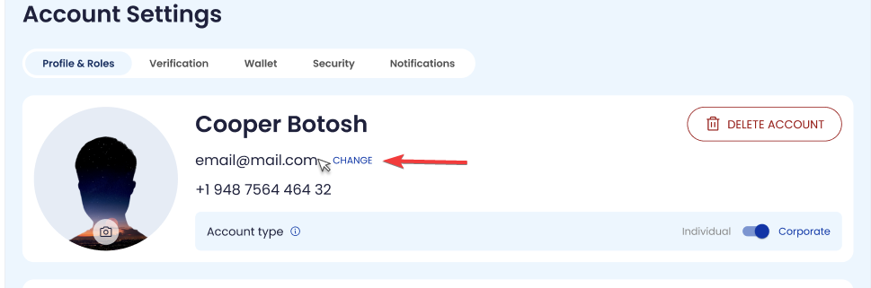 Click Change next to Email to open the email change flow.