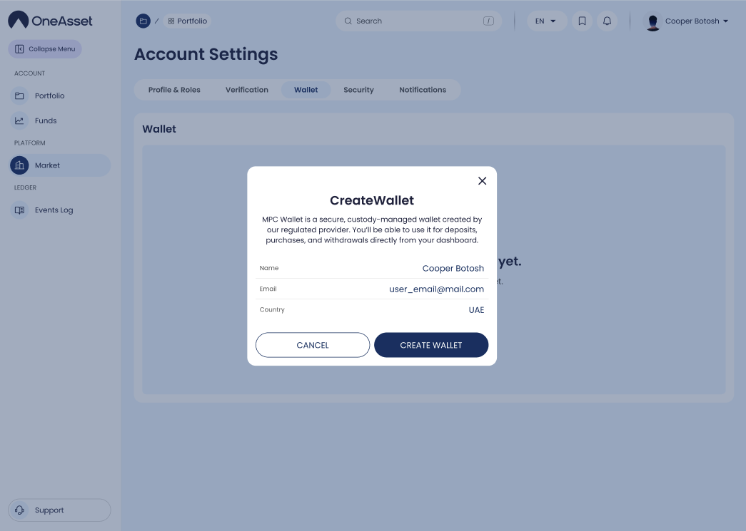 Wallet lets you create your unique USDC wallet (after KYC) and view your wallet address for deposits and distributions.