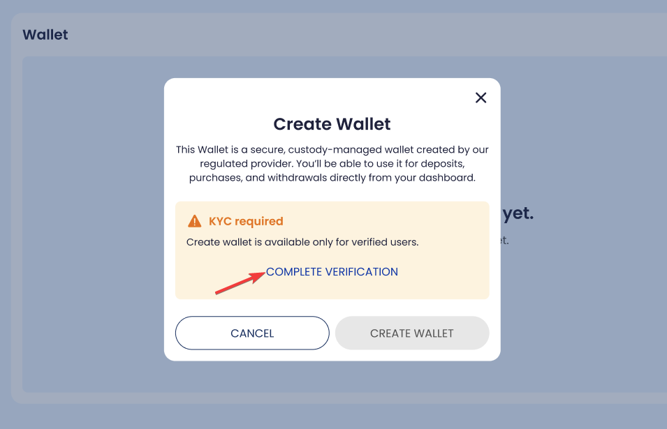 Wallet creation is available only if KYC is completed.