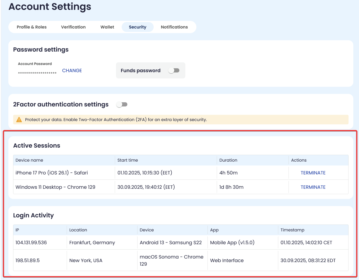 Active Sessions lists currently active devices; click Terminate to end a session.