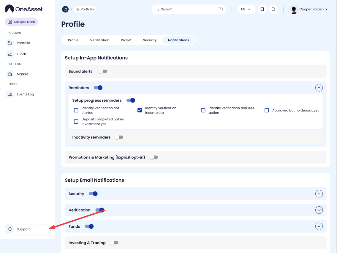 Click Support in the sidebar to open the Support page in the main content area.