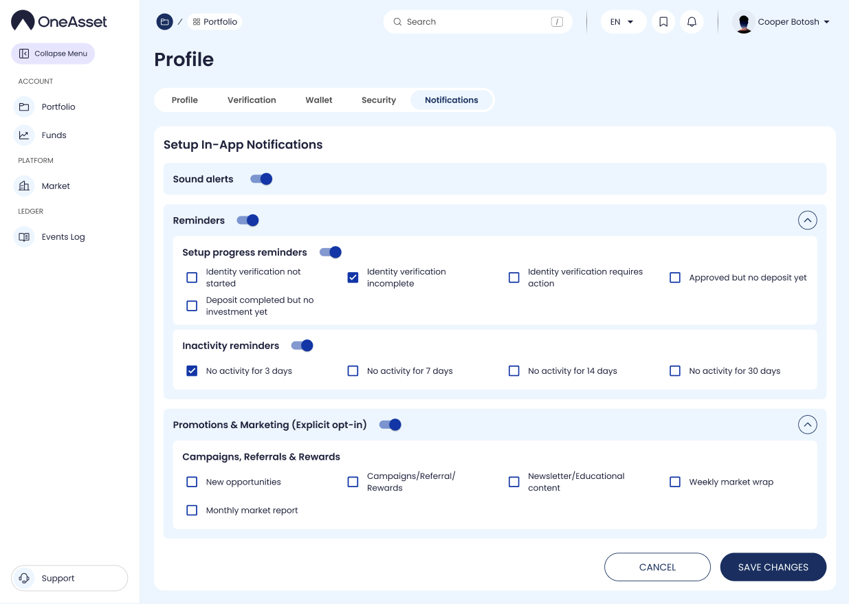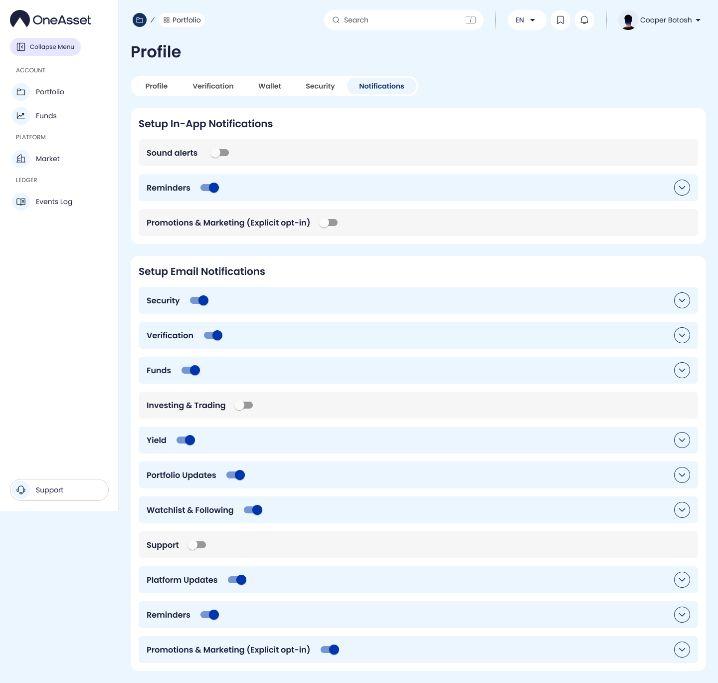 Email notifications are enabled/disabled per category (as displayed), for example: Security, Verification & Compliance, Funding & Payouts, Investing & Trading, Yield, Portfolio Updates, Watchlist & Following, Support, Platform, Updates, Reminders, Marketing.