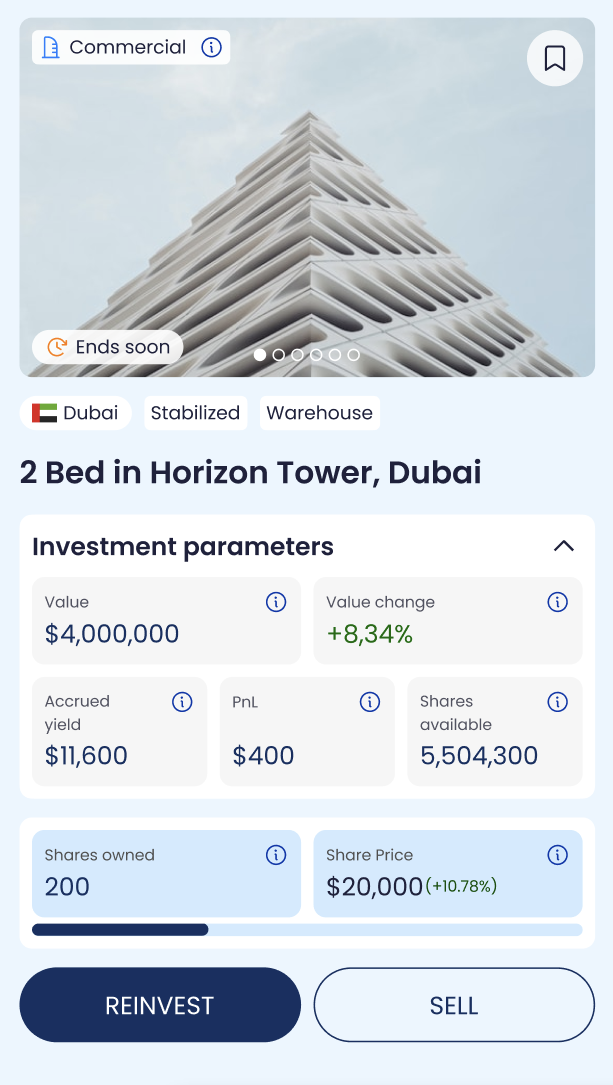 Owned shares lists all property positions currently held by the user and their key metrics. Each row represents a property position with owned share quantity and yield state.