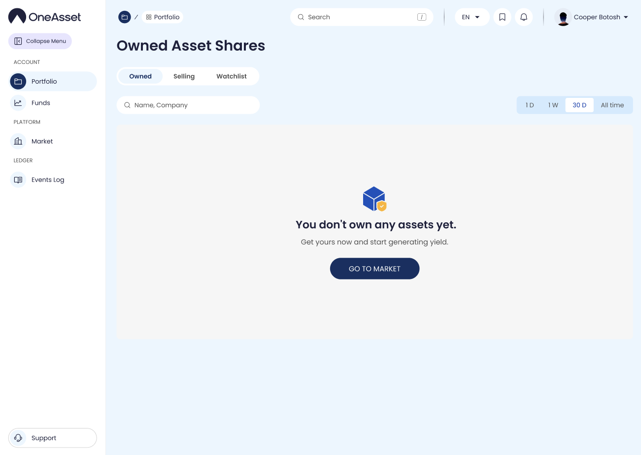 If no assets are owned, the page shows an empty state message and navigation guidance to Market.