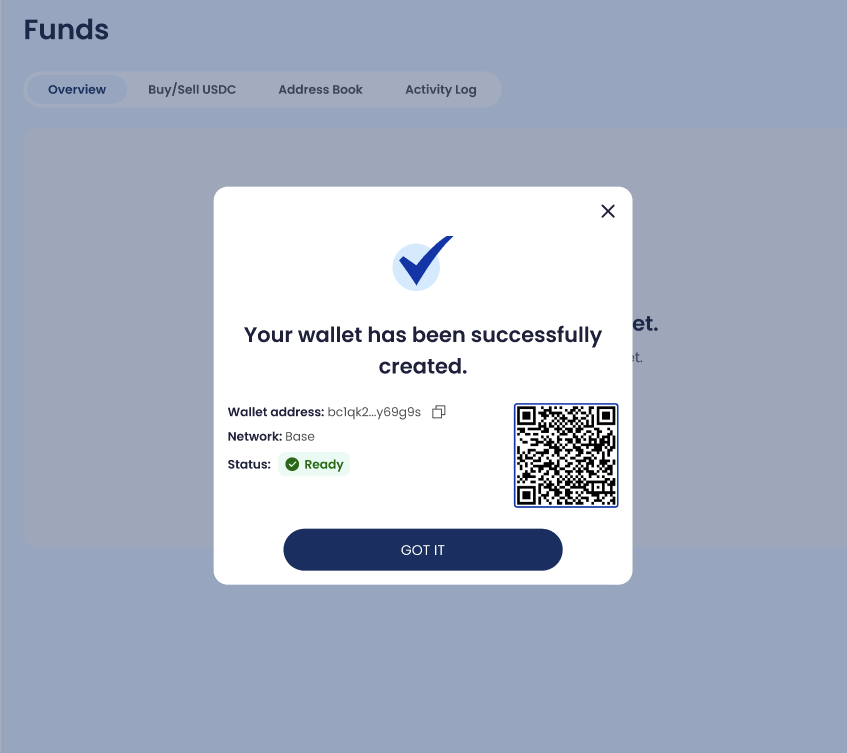 When created, the USDC Wallet Address appears in the USDC block.