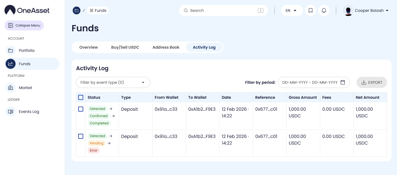 Activity Log is the ledger of all funding records and their statuses. It is the source of truth for balance changes.