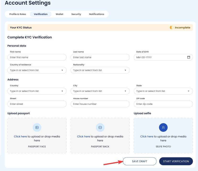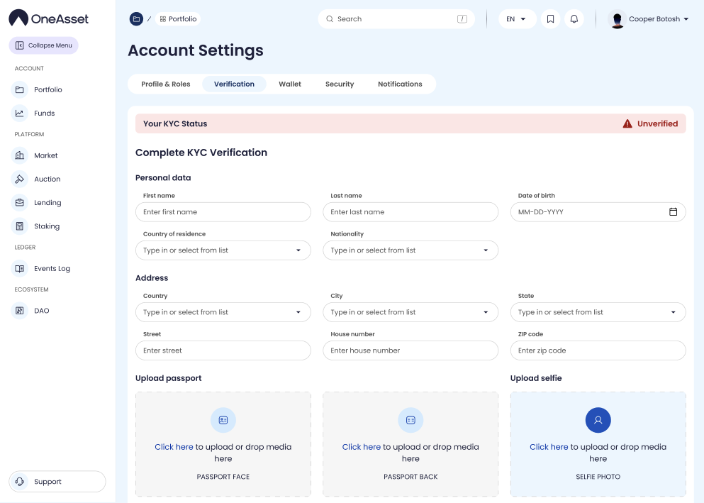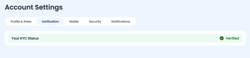 Verification collects and tracks identity verification status required for gated actions. Status is displayed as Unverified / Pending / Verified (as shown).