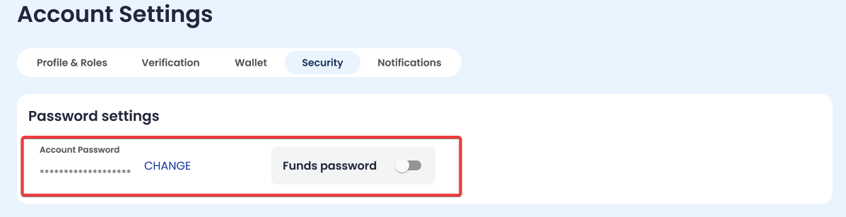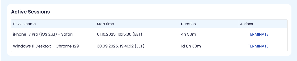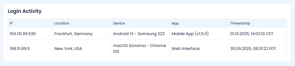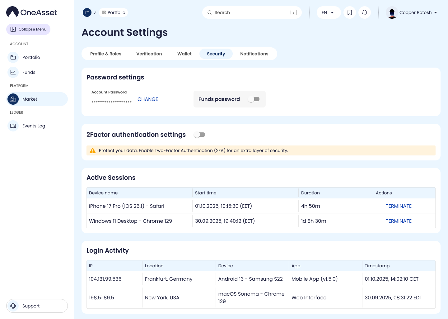 Security manages account passwords, optional 2FA configuration, active sessions, and login activity history.