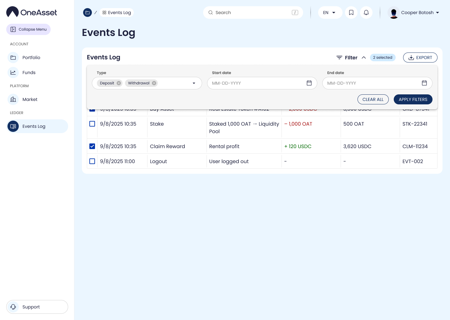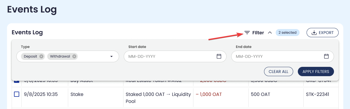 Use available filters such as date range, event type, status, and asset/property name.