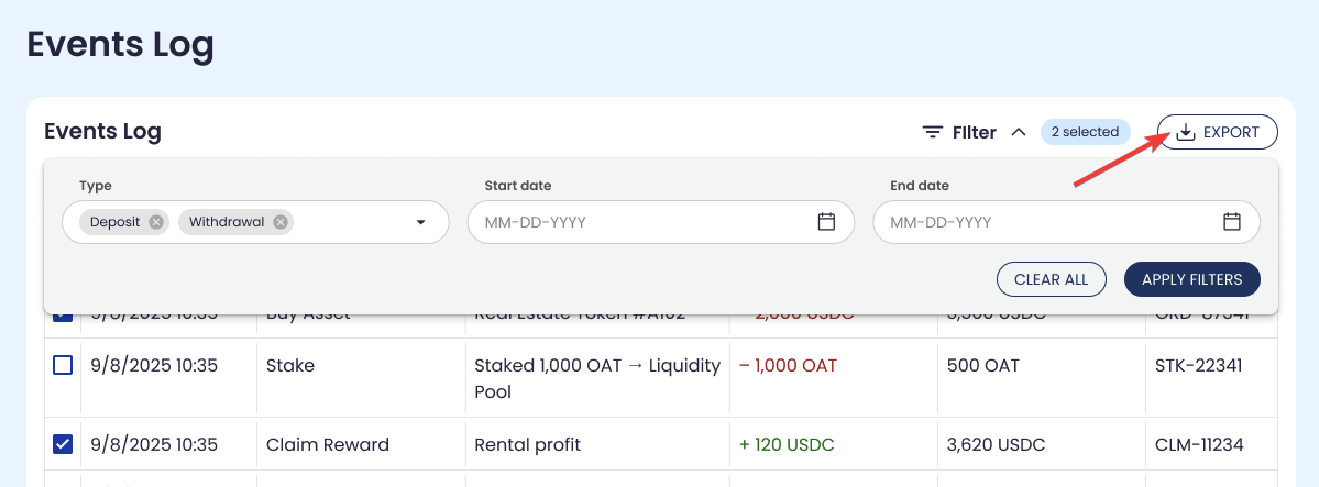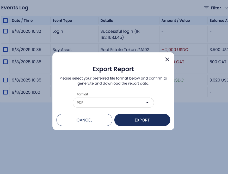 Export provides a downloadable record of Events Log entries if the feature is enabled.