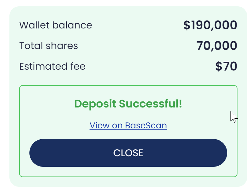After placement, the UI shows: “Deposit successful” and a link to the TX Hash with Close.