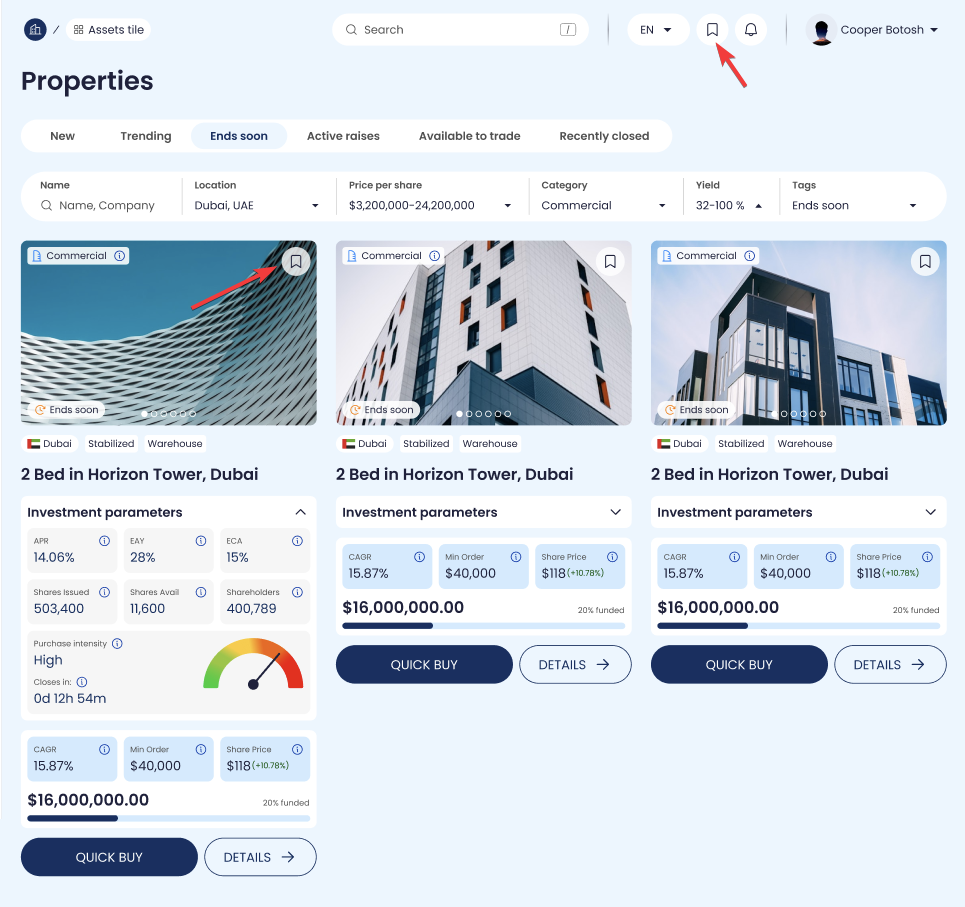 The Watchlist is a lightweight way for investors to save Properties they want to revisit. Instead of forcing users to make a decision immediately, Watchlist supports a “shortlist” workflow: scan → shortlist → compare → open details → buy.