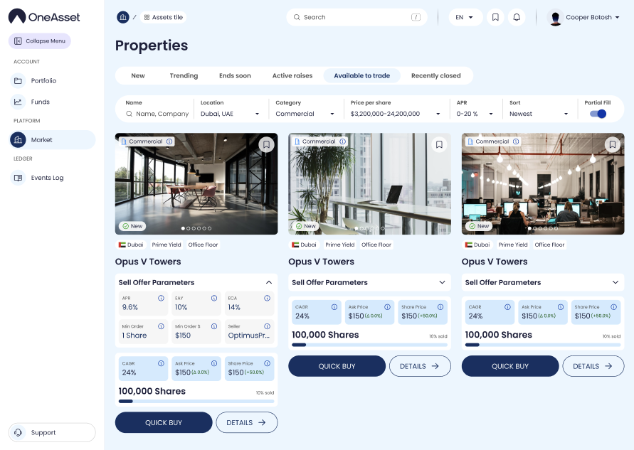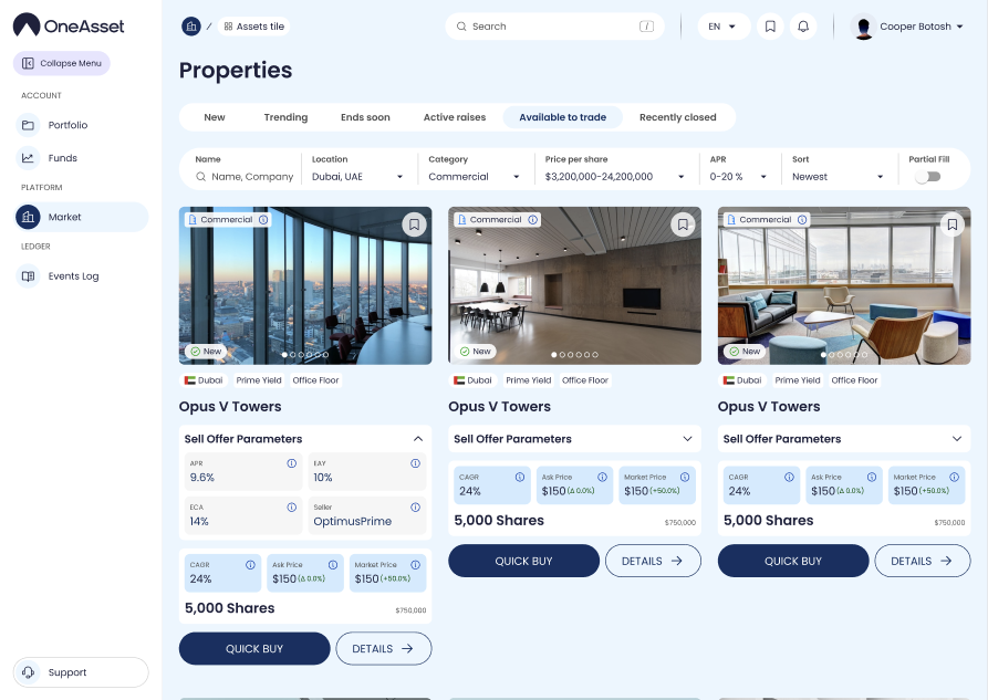 Each sell offer appears as a card with its asset summary, pricing, and order rules.